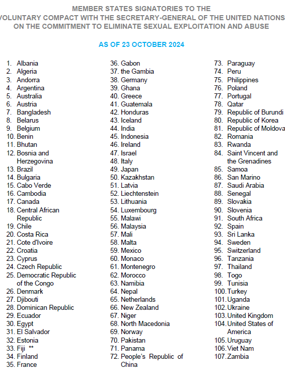 Updated list of signatories to the Voluntary Compact on the Commitment to Eliminate Sexual Exploitation and Abuse