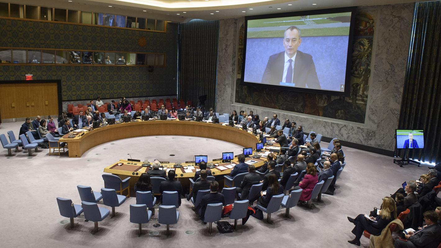 Nickolay Mladenov (on screen), UN Special Coordinator for the Middle East Peace Process, briefs the Security Council on the situation in the Middle East, including the Palestinian question. UN Photo/Loey Felipe - 22 January 2019