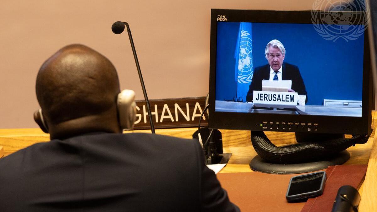 Tor Wennesland (on screen), Special Coordinator for the Middle East Peace Process, briefs the Security Council meeting on the situation in the Middle East, including the Palestinian question. (UN Photo / Eskinder Debebe - 22 March 2022)
